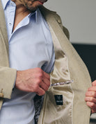 Confectionné dans un tissu texturé beige clair, il se distingue par ses finitions en suédine camel sur la poche poitrine et les poches basses qui apportent une touche de raffinement discret. Sa coupe semi-ajustée offre un équilibre parfait entre confort et modernité, tandis que la doublure satinée assure une finition fluide et haut de gamme.