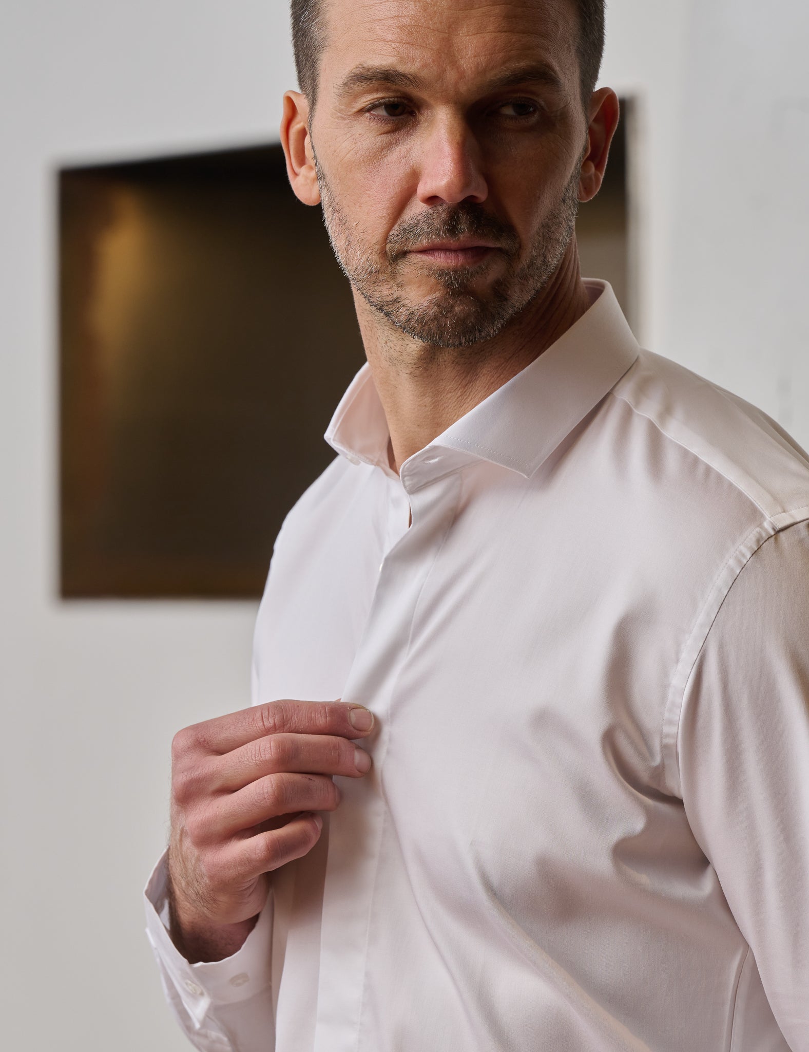 La chemise Ashton blanche à boutons cachés s'impose comme une pièce emblématique du vestiaire masculin moderne.