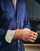 Confectionnée en 100% coton haut de gamme avec finition liquide ammoniac, elle offre une texture douce, respirante et un rendu impeccable facile d'entretien. Son marine pur incarne l'élégance classique et la polyvalence, tandis que le col intérieur contrasté en tissu imprimé apporte une touche d'originalité discrète mais raffinée.