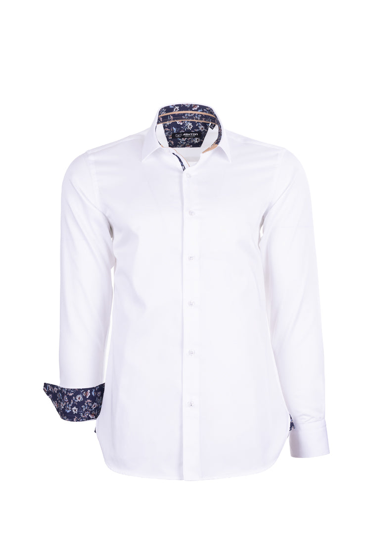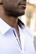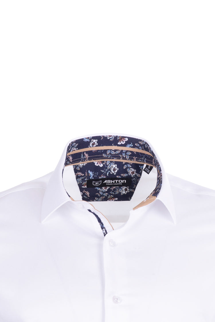 Apportez une touche d’originalité à votre tenue avec cette chemise homme blanche Ashton coupe ajustée, une pièce élégante qui combine sobriété et détails sophistiqués. Son design épuré est sublimé par un intérieur de col et de poignets à motif floral bleu, qui apporte une signature moderne et distinguée.