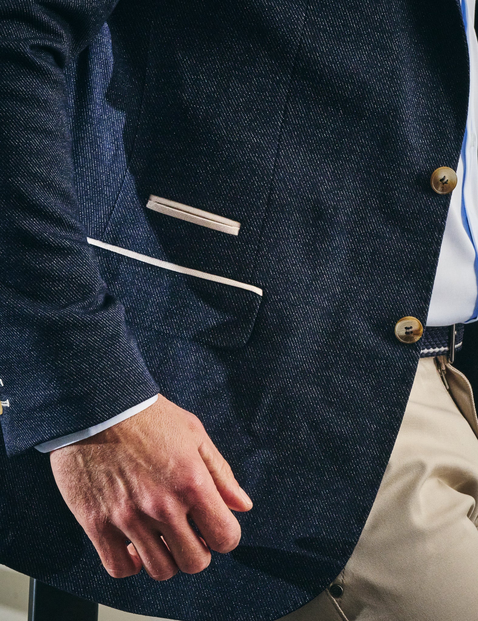 Confectionné dans un tissu texturé bleu jeans profond, il se distingue par ses pochettes et coudières contrastées couleur sable qui apportent une touche contemporaine et chic. Sa coupe semi-ajustée offre un équilibre parfait entre confort et modernité, tandis que la doublure satinée assure une finition fluide et haut de gamme.
